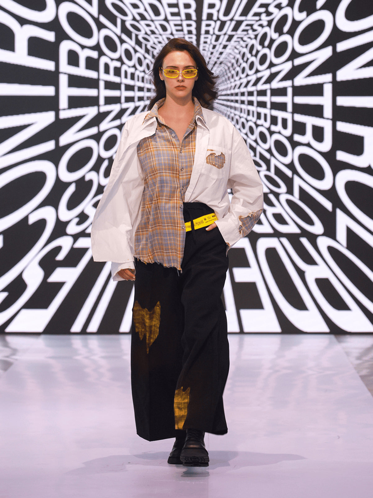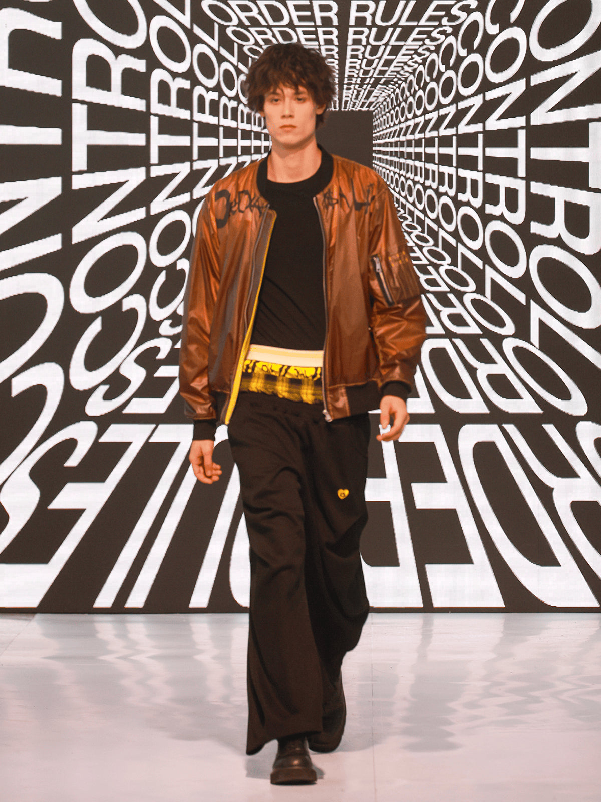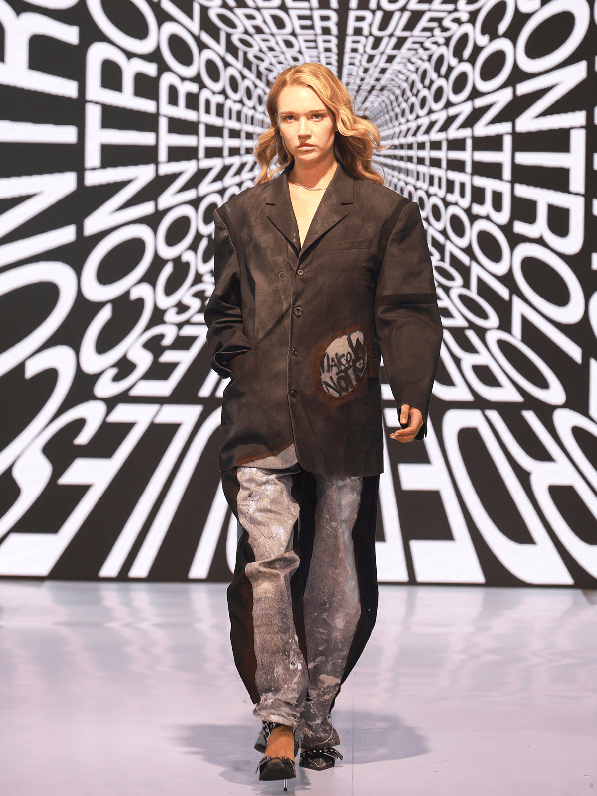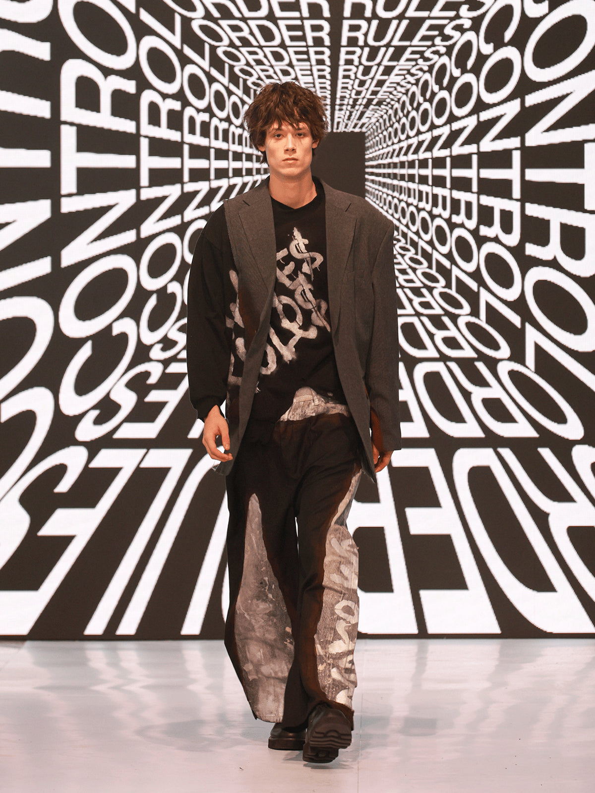 "MAKE WAVES NOT RULES" opens with a quiet but decisive gesture: removing the control tape that marks the runway. That simple act becomes the transition from boundary to possibility, setting the tone for a presentation shaped by motion, reinterpretation, and youth clarity. The show unfolds like a narrative where each look reveals another layer of reconstruction.
