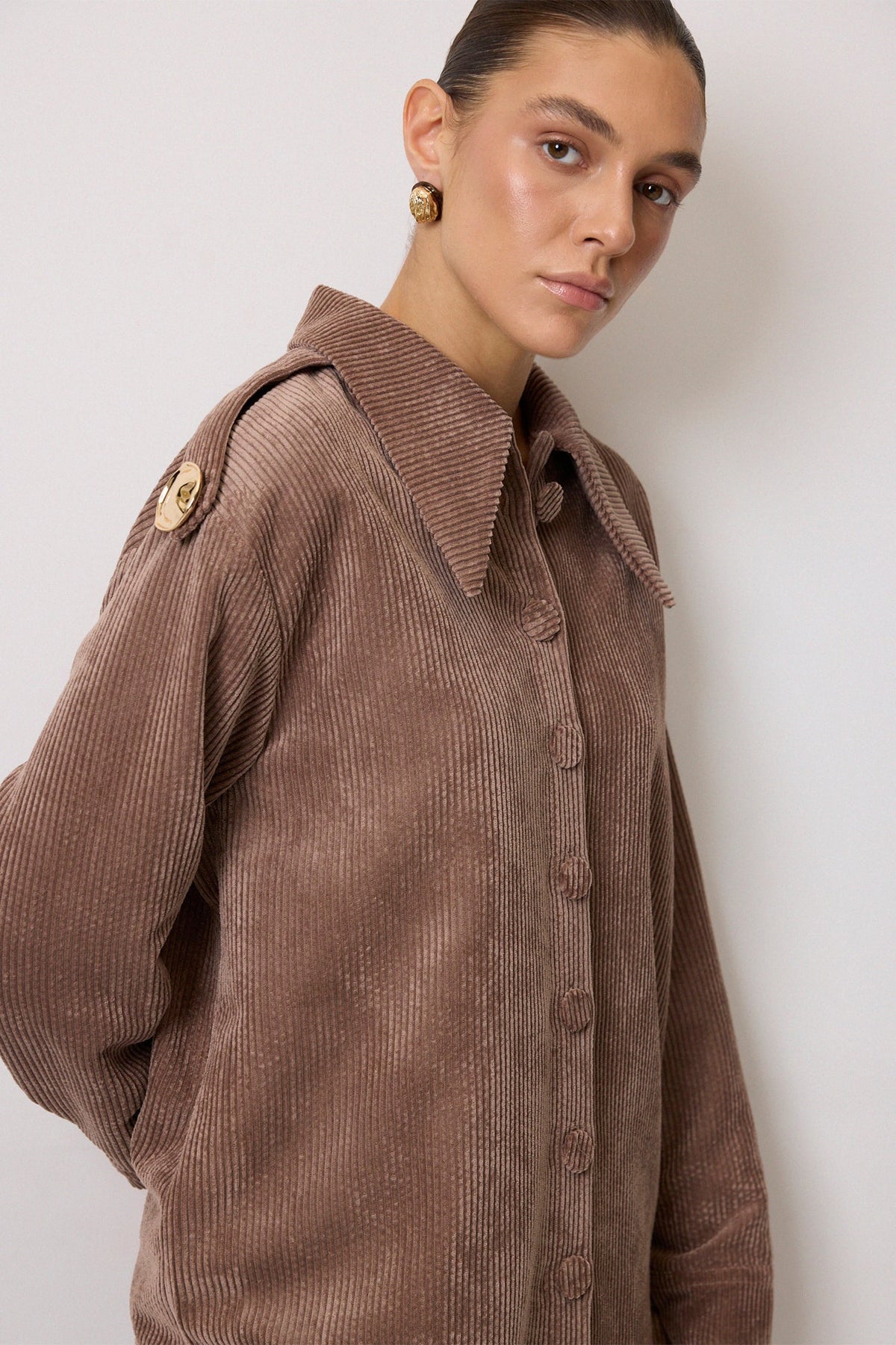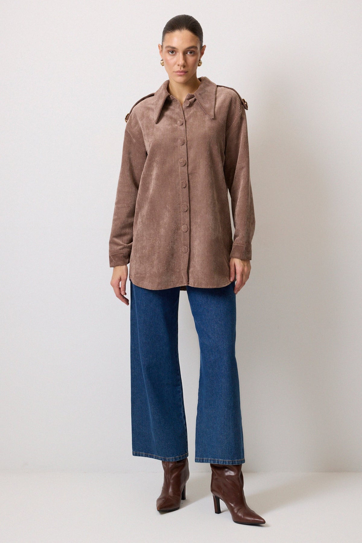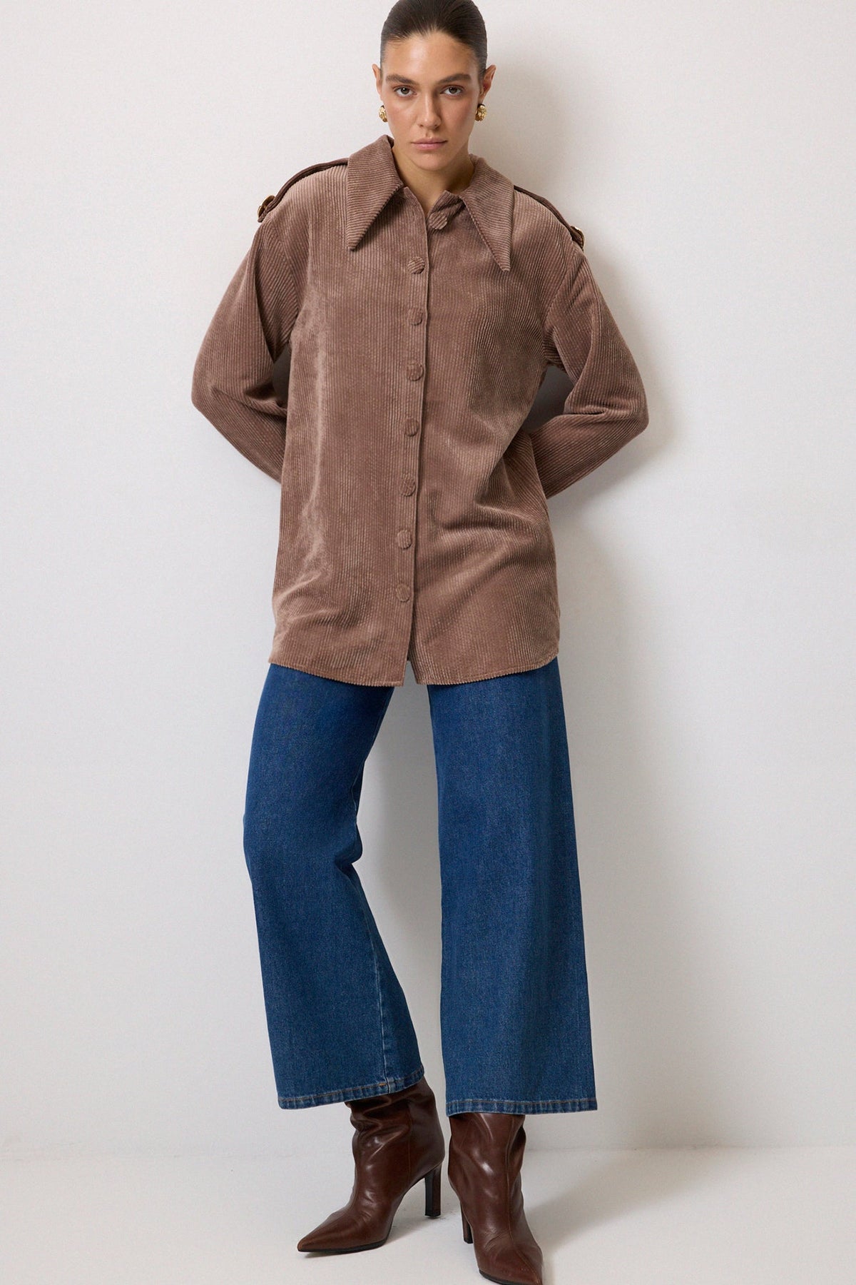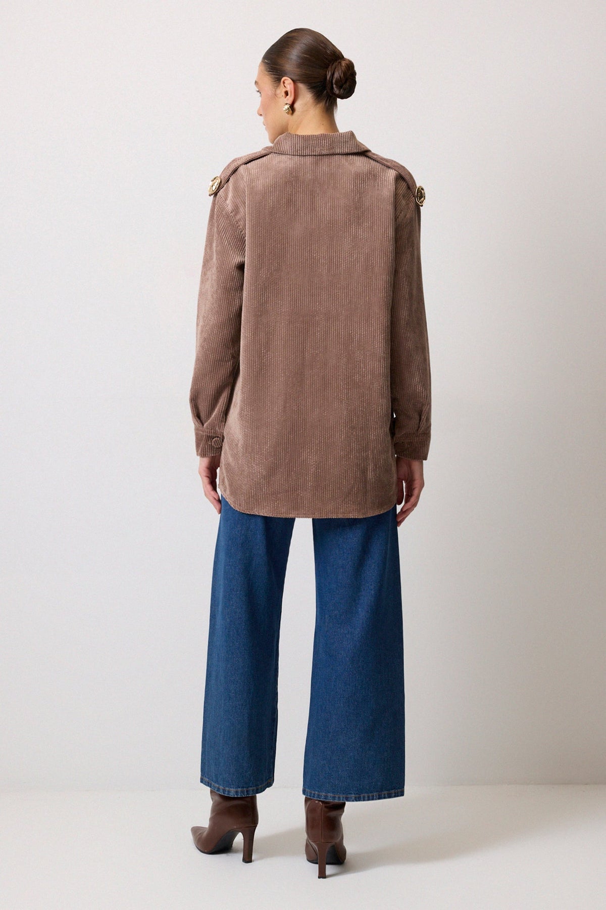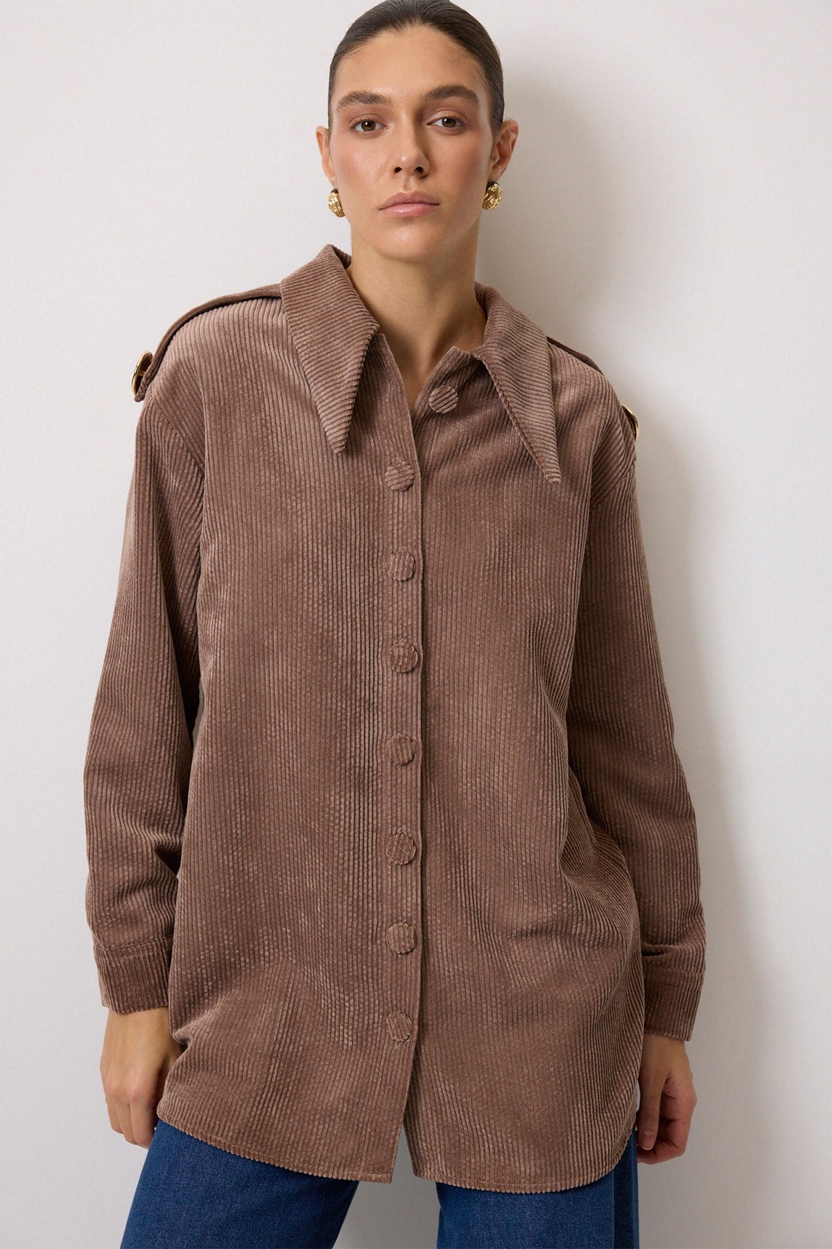 APOLET DETAYLI FİTİLLİ KADİFE GÖMLEK